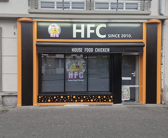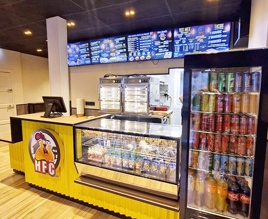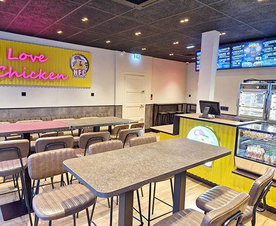 Dans le cadre du déploiement de sa nouvelle charte graphique, HFC – House Food Chicken, snack bar situé à Rennes, nous a confié l’agencement et l’aménagement de la zone comptoir.