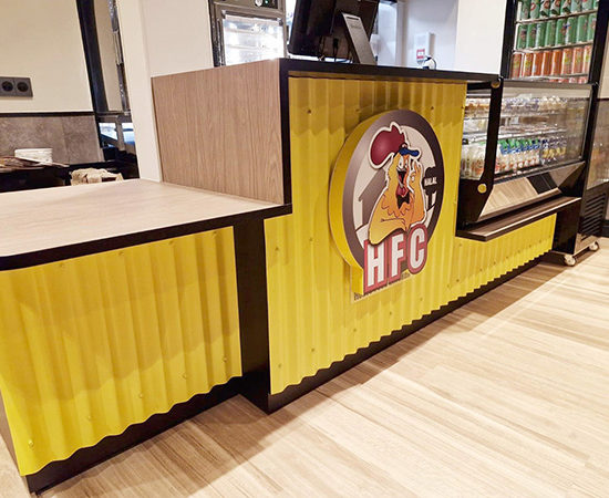 Situé dans le centre de Rennes, à proximité de la Gare et à deux pas du Liberté, le restaurant de food street HFC a confié une partie de l’aménagement de son point de vente à notre équipe. Notre mission a consisté à concevoir et fabriquer l’espace comptoir, zone centrale du snack bar.