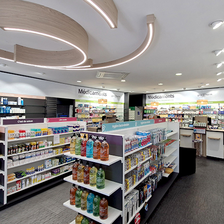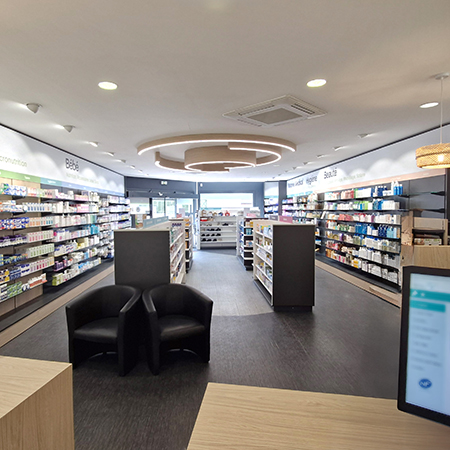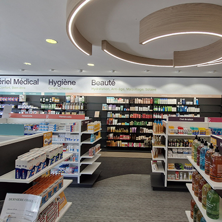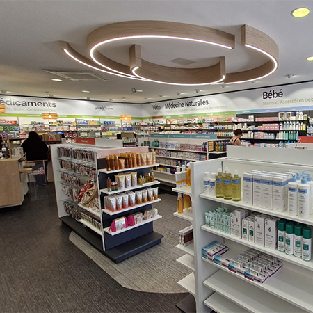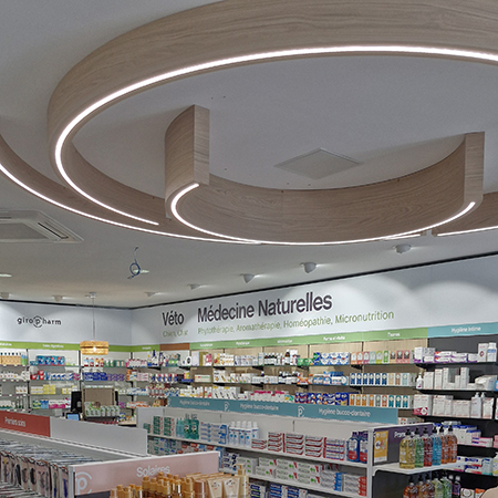 • Une ambiance lumineuse douce et enveloppante, qui transforme l’accueil de la pharmacie ;